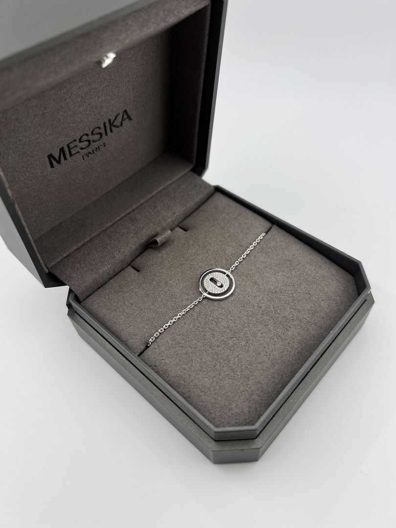 Изящный золотой браслет Lucky Move PM от легендарного бренда Messika. Модель выполнена из золота 750 пробы весом 5,24 грамма и инкрустирована сияющими бриллиантами. Роскошное украшение в размере 17,5, воплощающее современную элегантность и неповторимый стиль ювелирного дома.