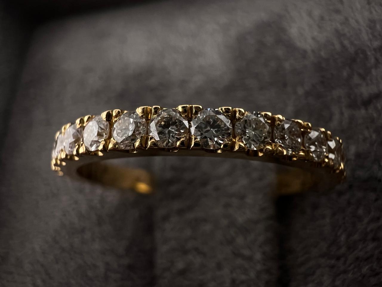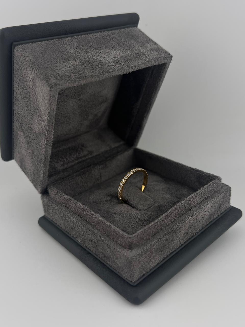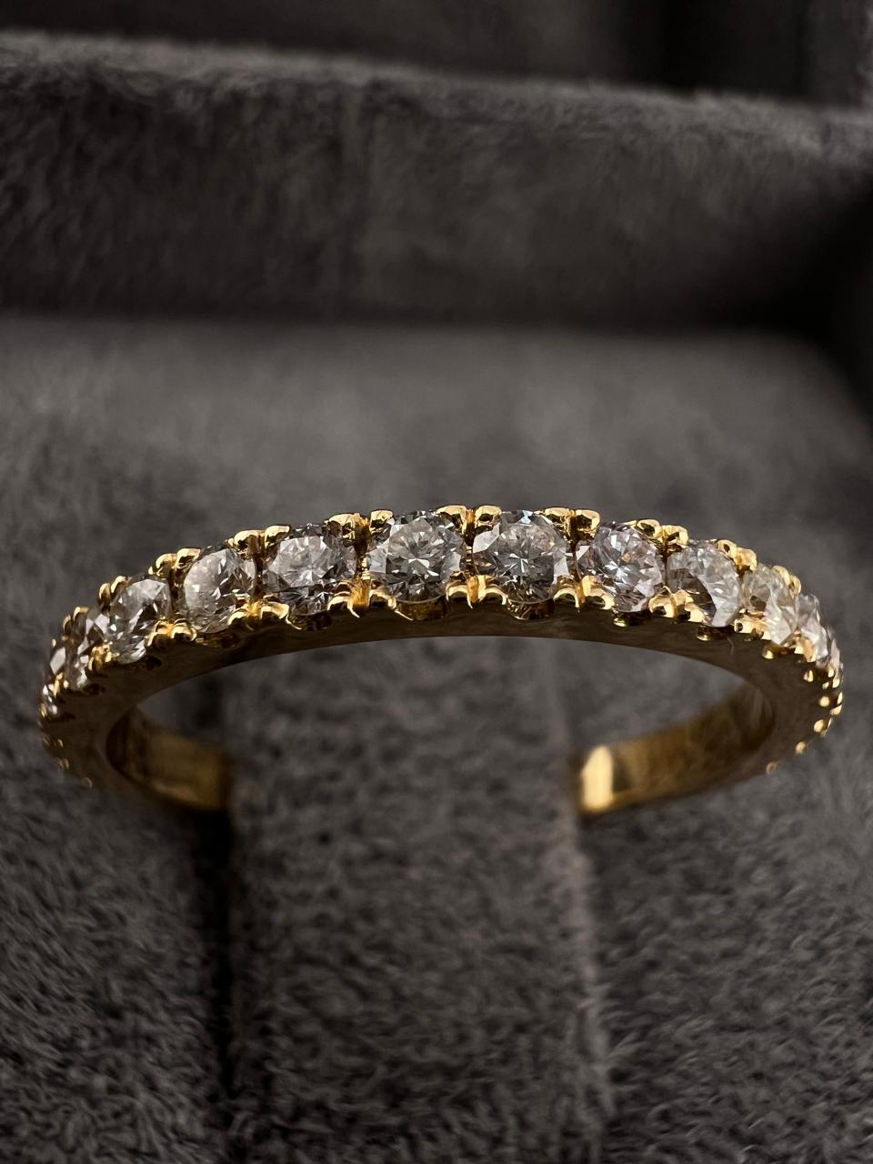 Изысканное золотое кольцо 750 пробы, выполненное в классическом дизайне «дорожка». Модель весом 2,9 грамма украшена сияющими бриллиантами, которые создают непрерывную линию блеска. Элегантное украшение 18 размера, идеально подходящее как для особого случая, так и для повседневного образа.