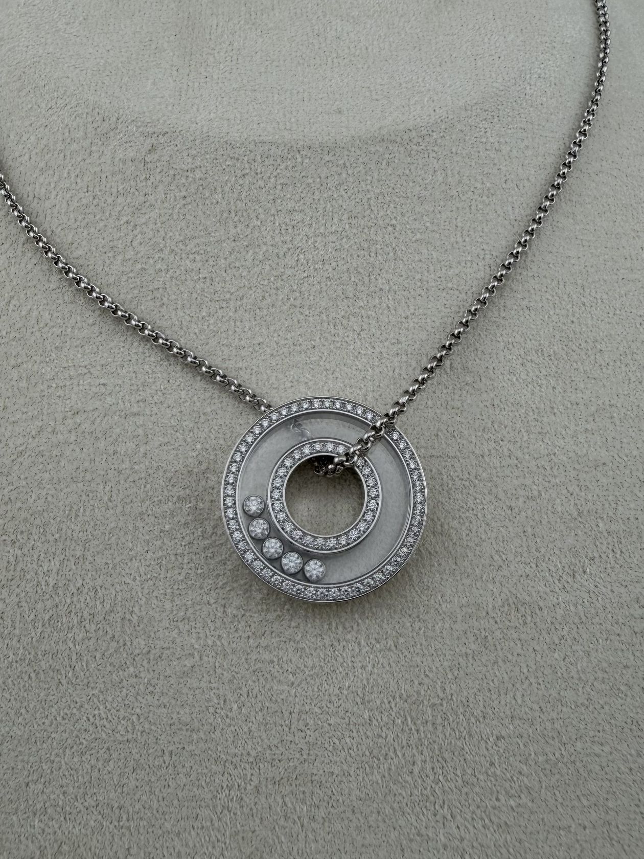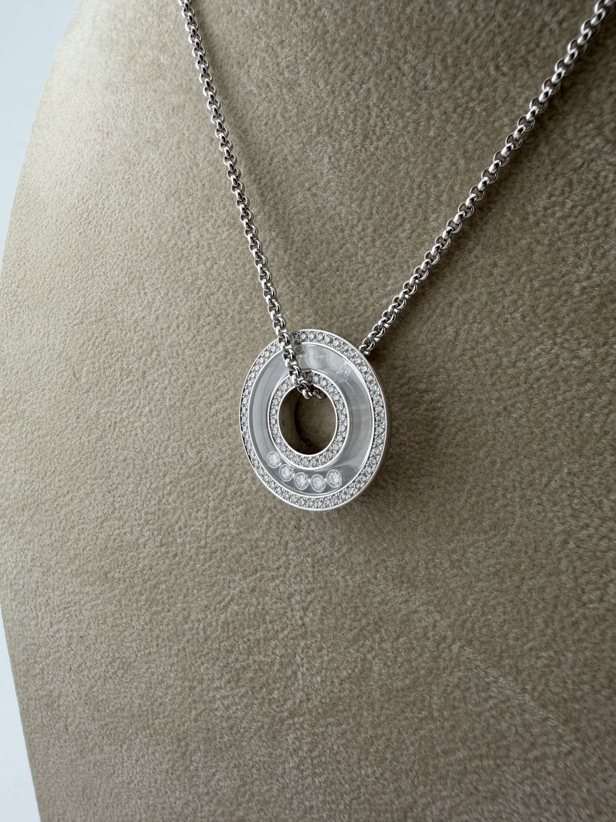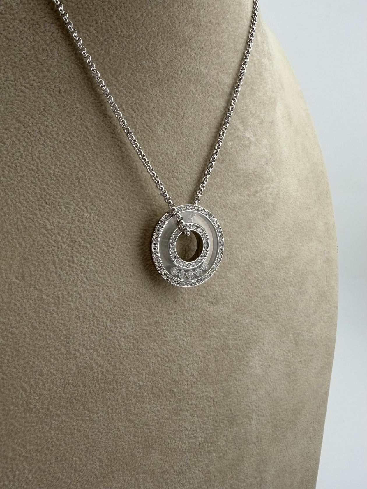 Изысканный кулон Chopard из коллекции Happy Diamonds, выполненный из желтого золота 750 пробы. Узнаваемый дизайн с легендарными подвижными бриллиантами под сапфировым стеклом создает неповторимую игру света. Роскошное украшение весом 11,41 грамма, воплощающее философию радости и элегантности швейцарского ювелирного дома.