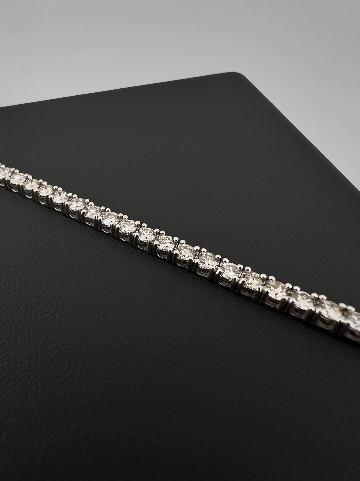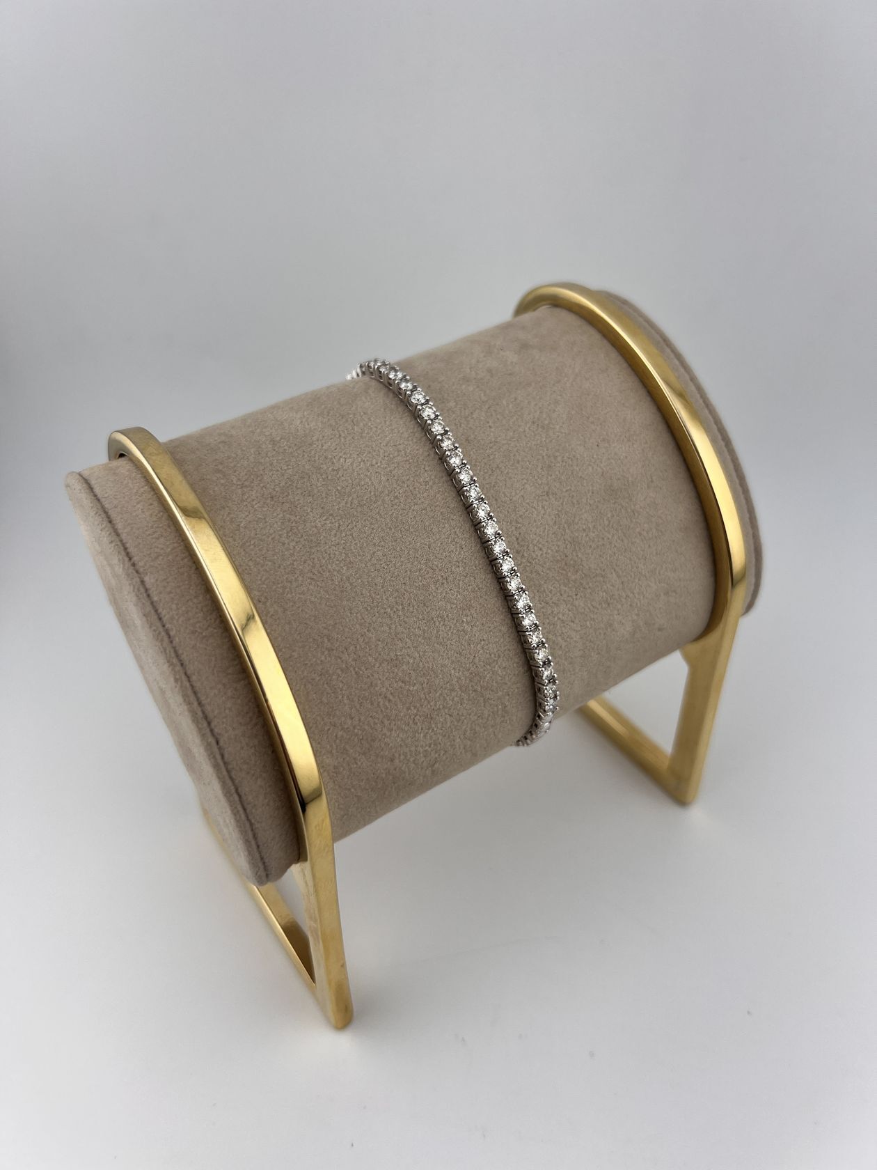 Изящный золотой браслет в классическом стиле «теннис» выполнен из золота 750 пробы. Украшение весом 10 грамм дополнено сияющей дорожкой из бриллиантов общим весом 1,52 карата. Роскошный аксессуар 17,5 размера, который подчеркнет статус и безупречный вкус своей обладательницы.