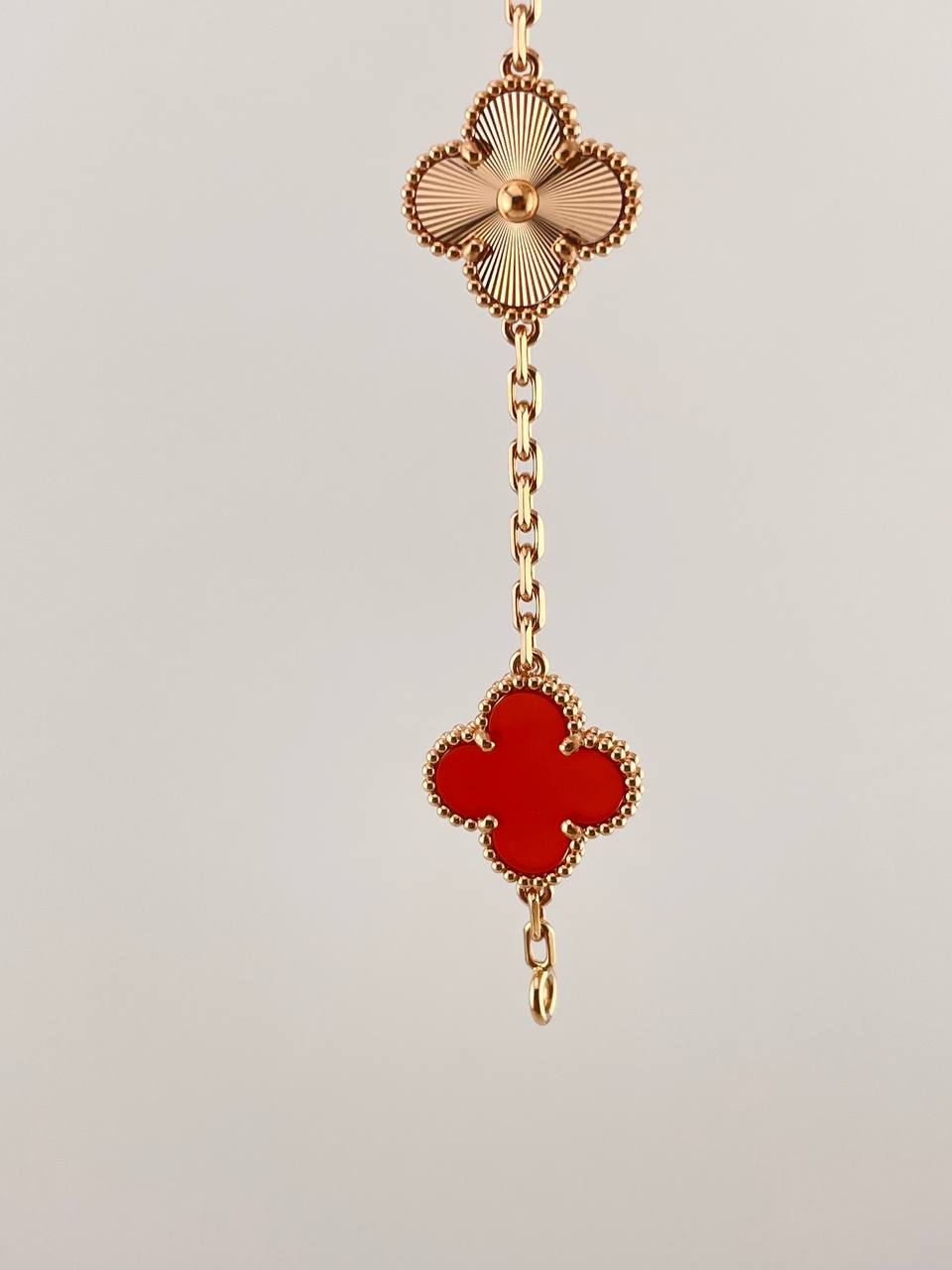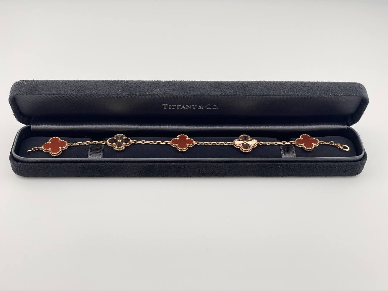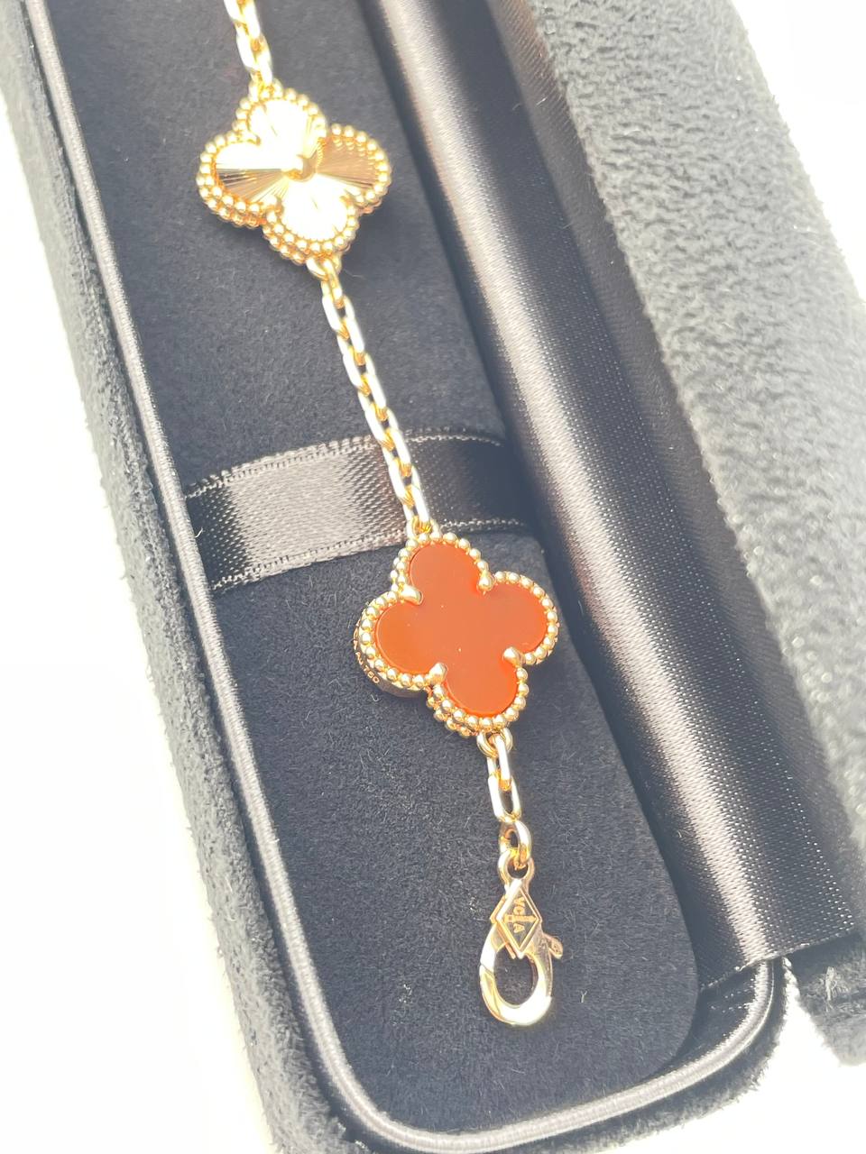 Изысканный браслет Van Cleef из коллекции Alhambra, выполненный из желтого золота 750 пробы. Украшение декорировано вставками из натурального сердолика, подчеркивающими легендарный дизайн четырехлистника. Элегантный аксессуар 19 размера, воплощающий классический стиль и утонченность знаменитого ювелирного дома.