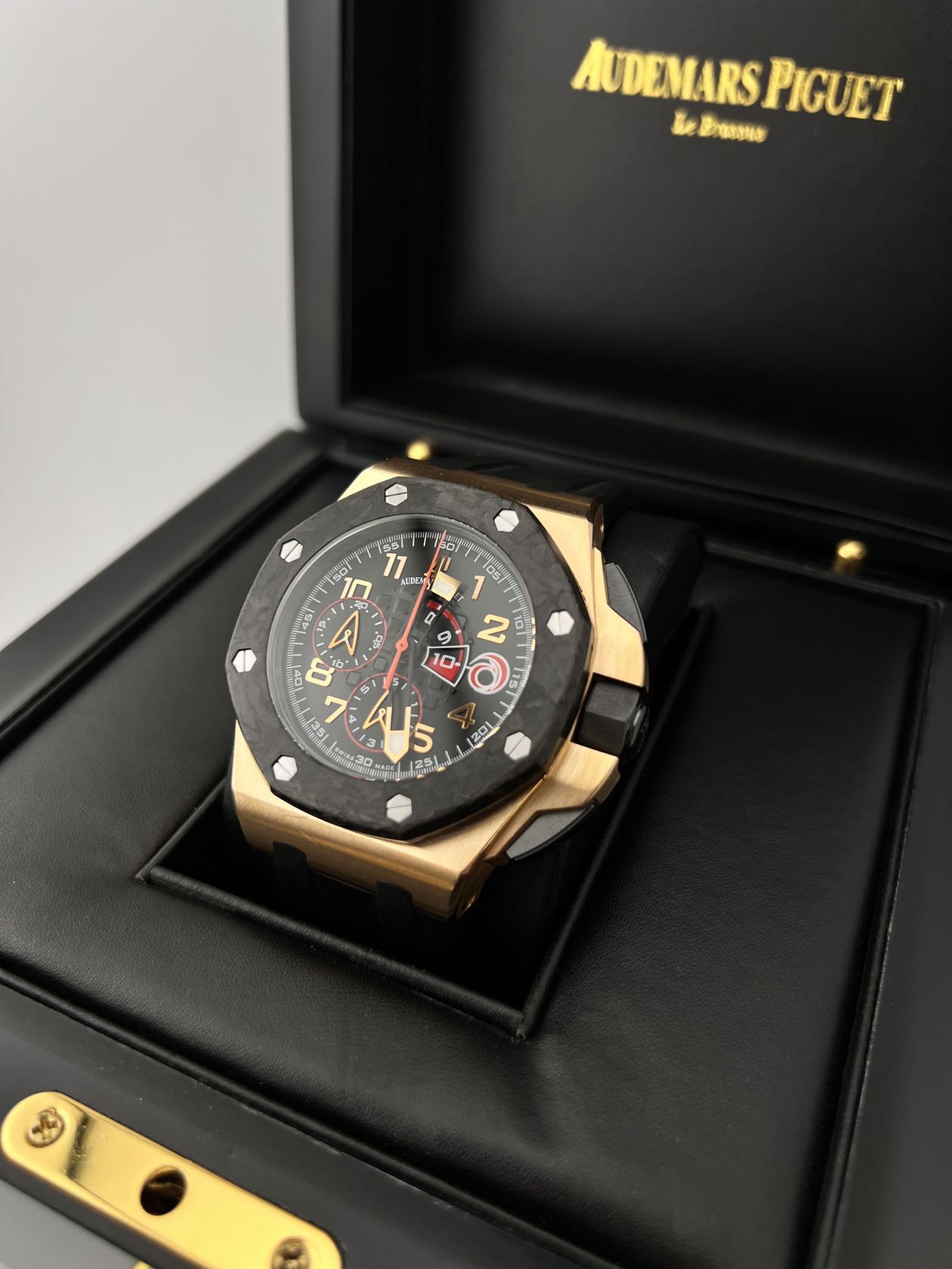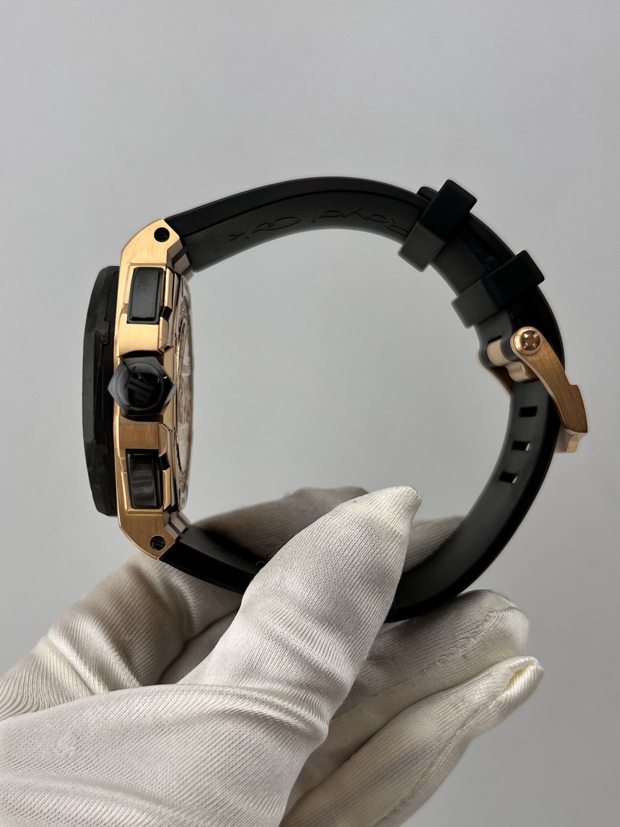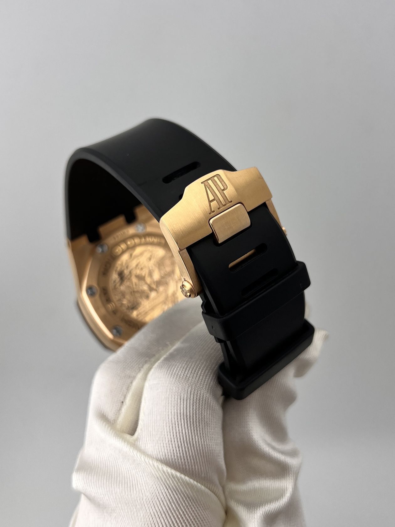 Роскошные швейцарские часы Audemars Piguet Royal Oak в массивном 44-миллиметровом корпусе из розового золота. Модель оснащена точным механизмом с автоподзаводом и дополнена практичным каучуковым ремешком. Идеальное сочетание легендарного дизайна, благородных металлов и спортивного стиля.