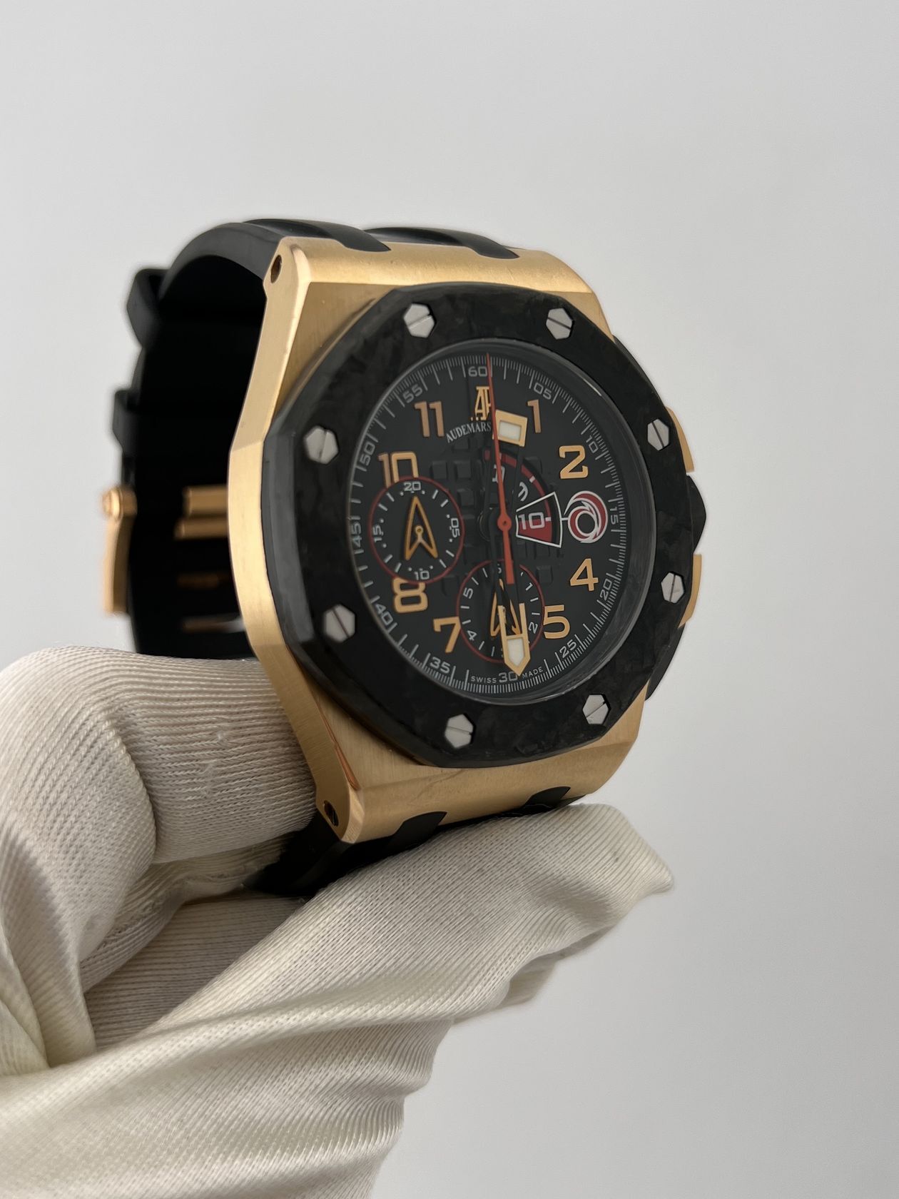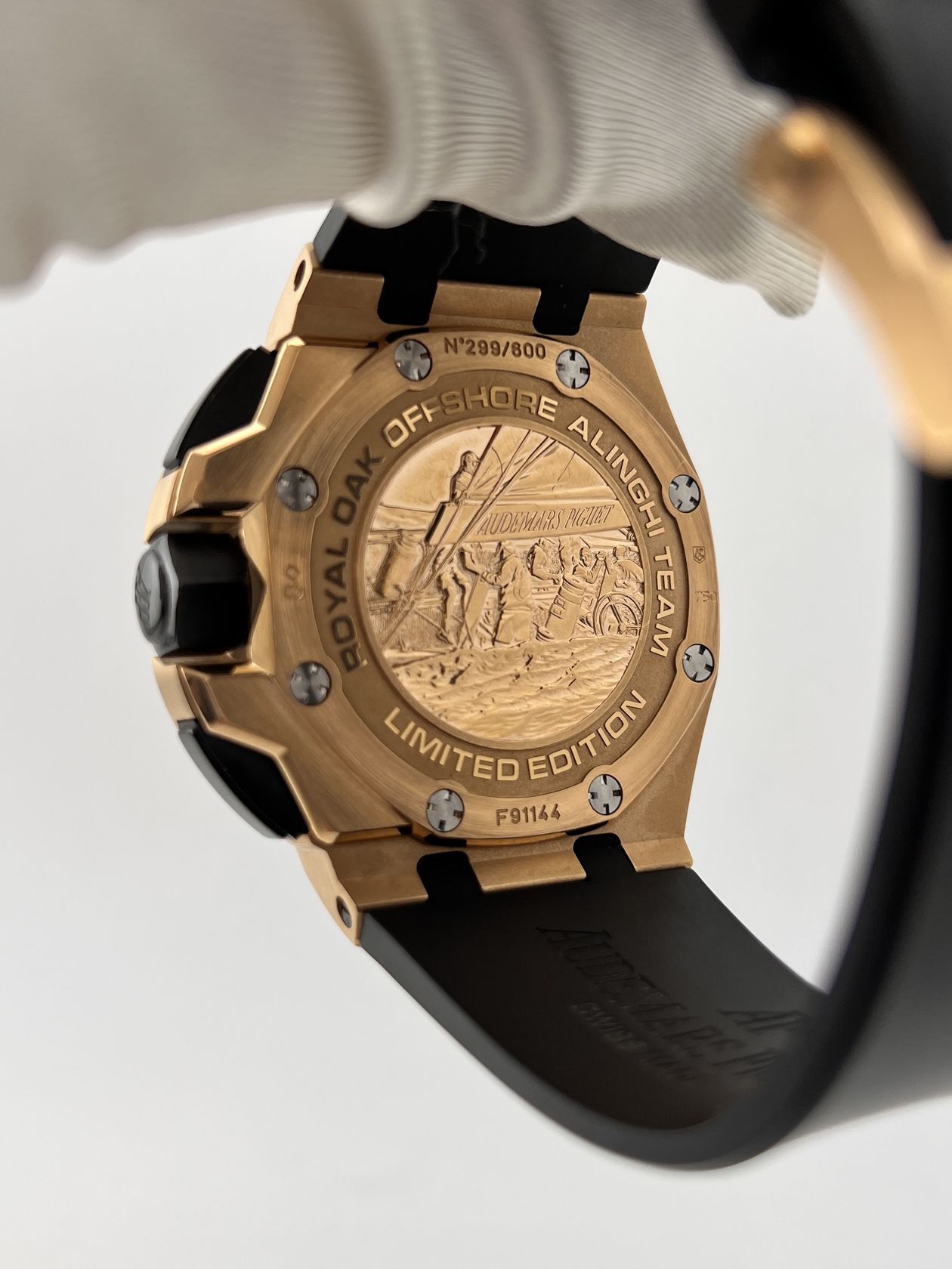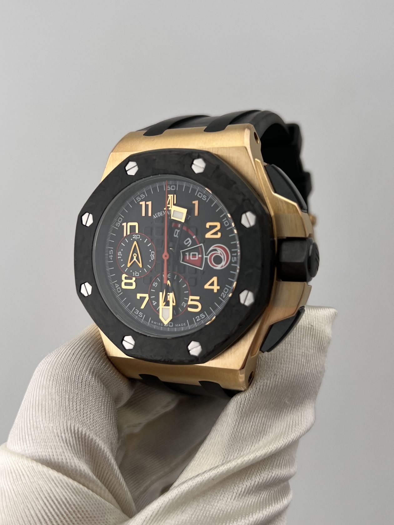 Роскошные швейцарские часы Audemars Piguet Royal Oak в массивном 44-миллиметровом корпусе из розового золота. Модель оснащена точным механизмом с автоподзаводом и дополнена практичным каучуковым ремешком. Идеальное сочетание легендарного дизайна, благородных металлов и спортивного стиля.