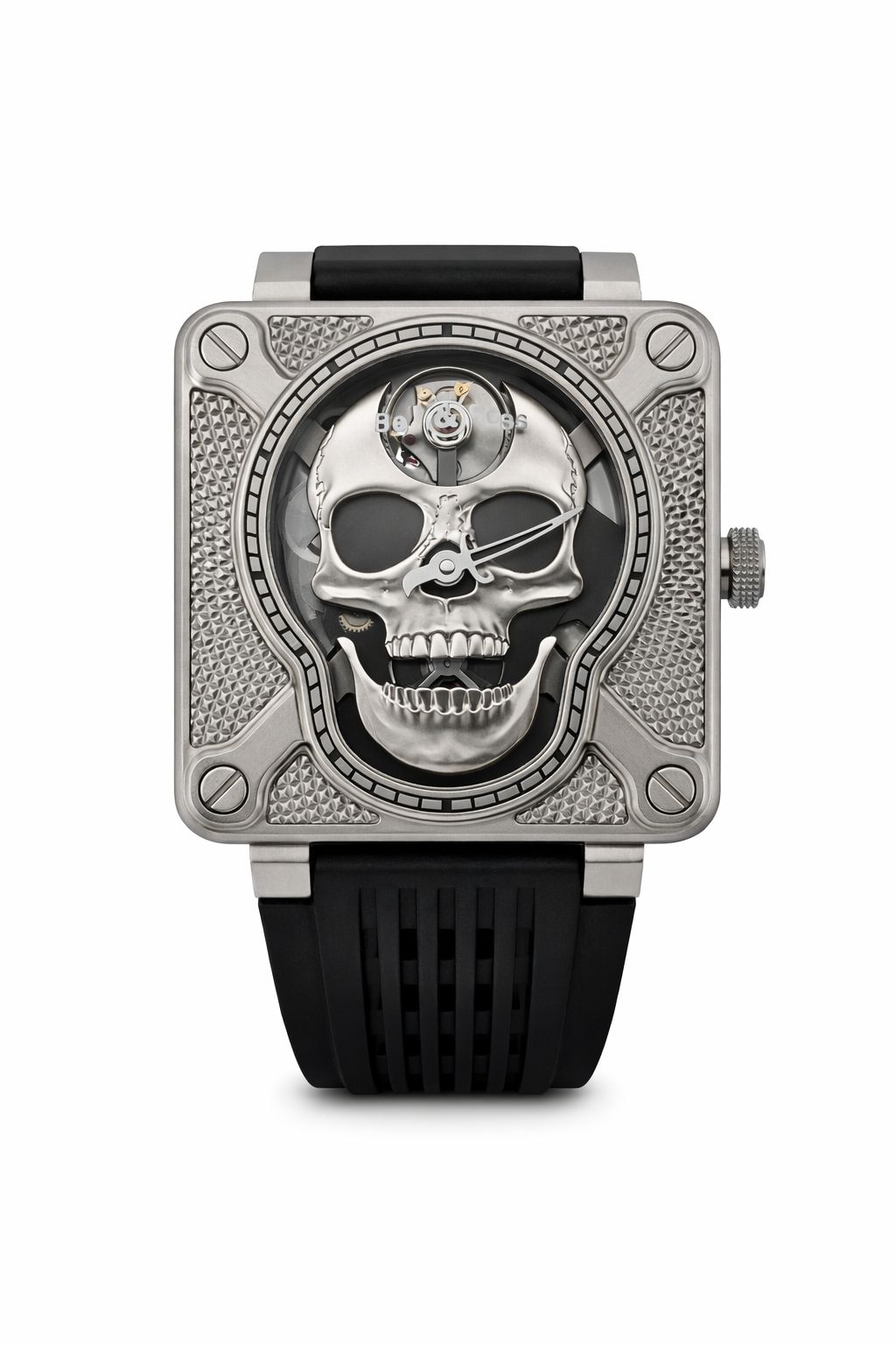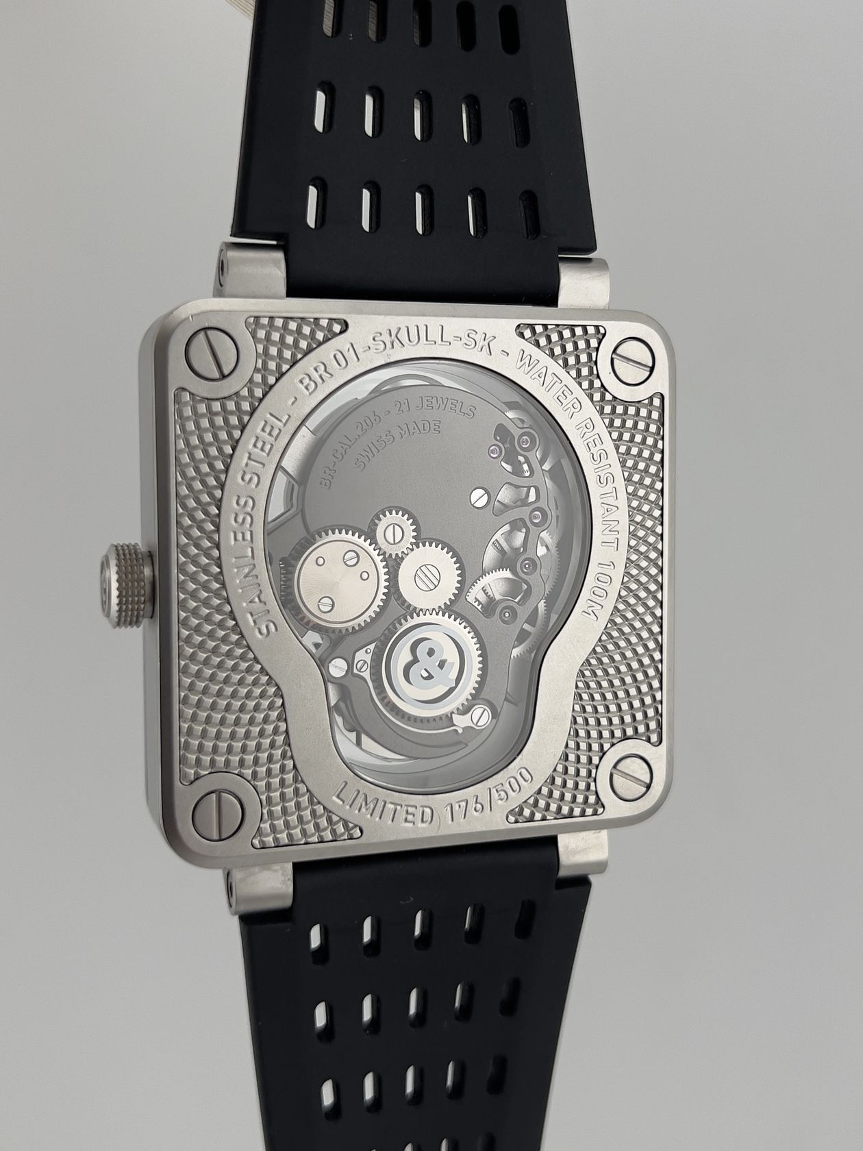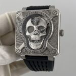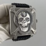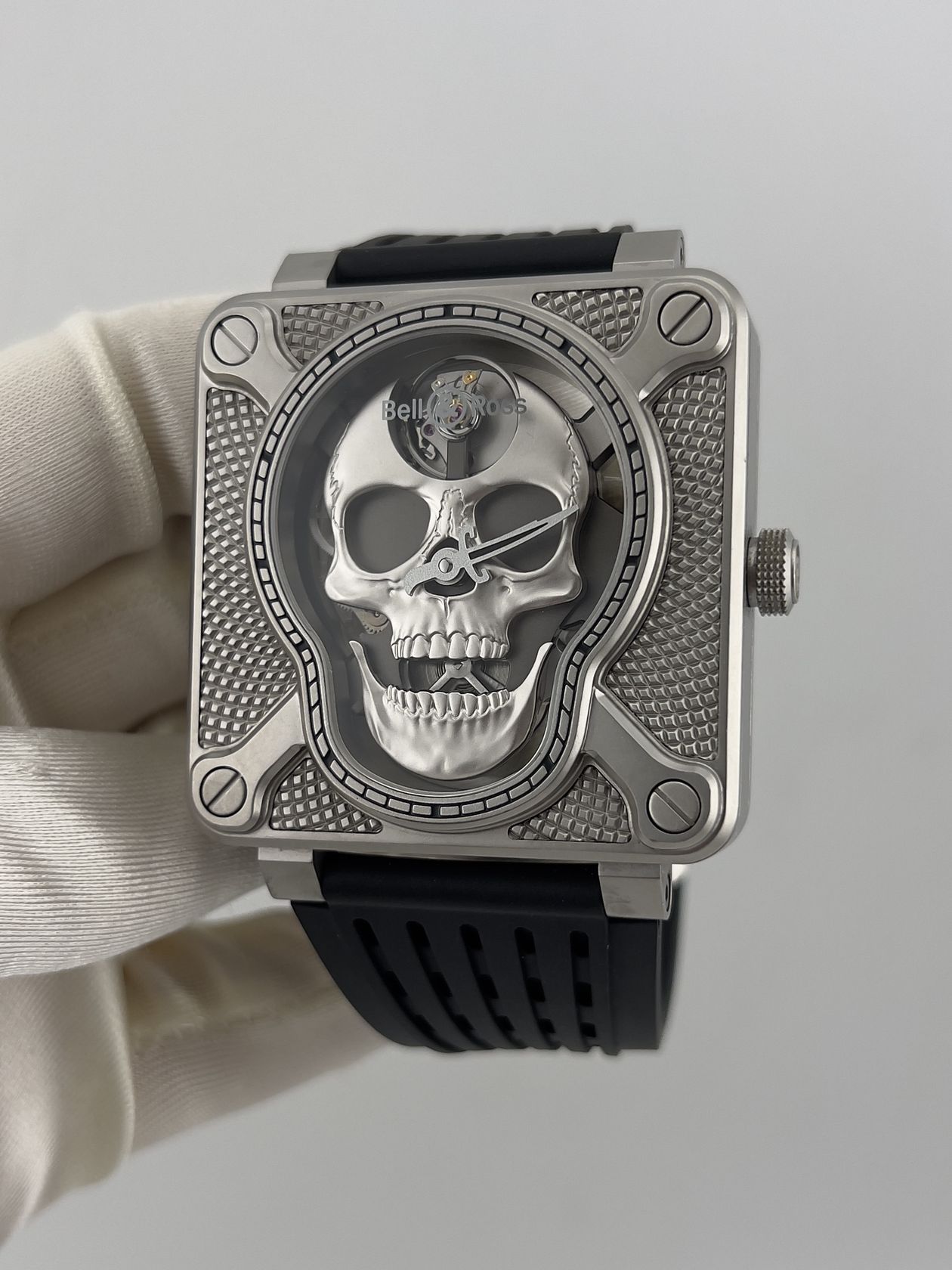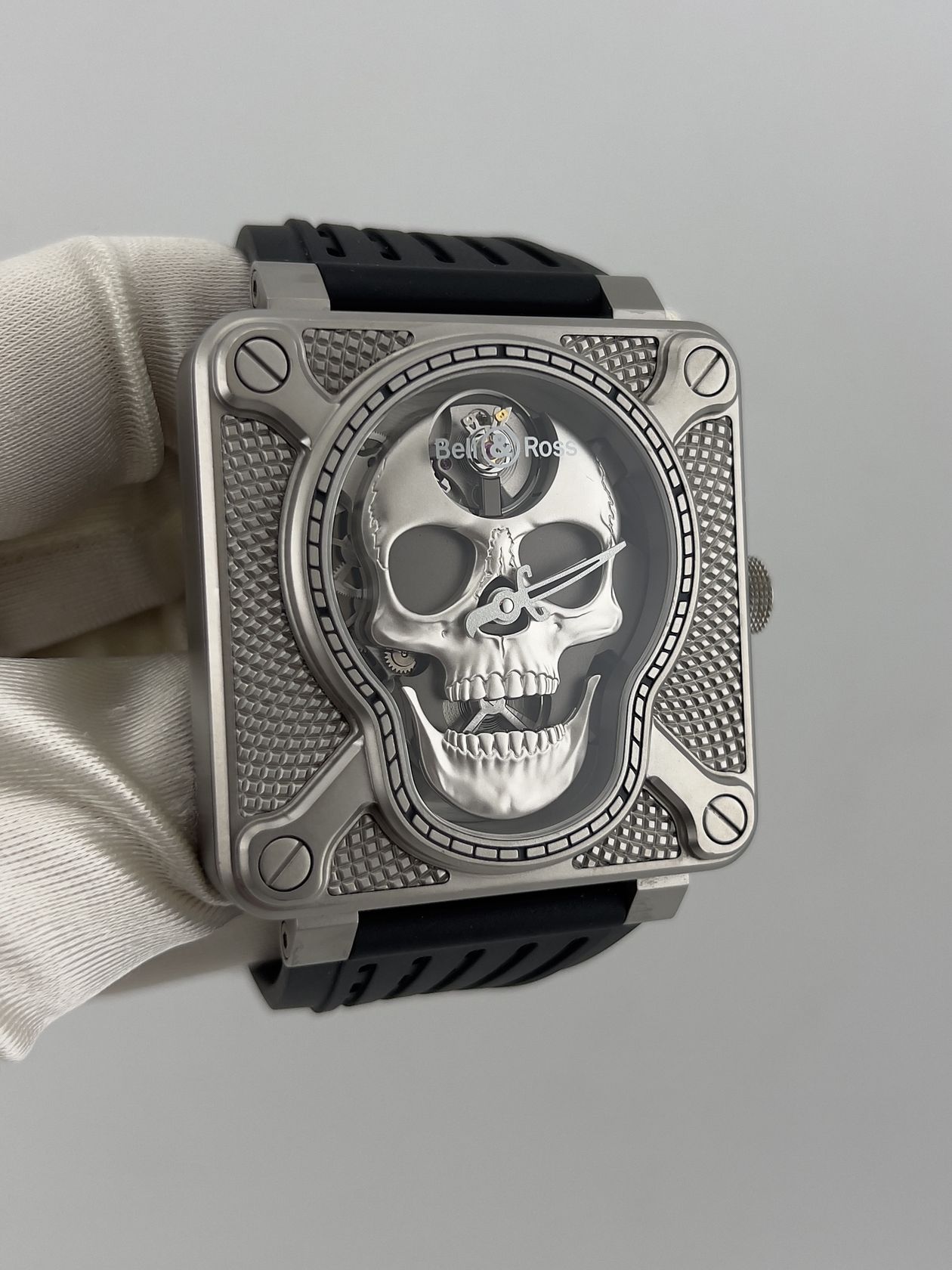 Эффектные мужские часы Bell & Ross BR01 Laughing Skull с механизмом ручного завода. Корпус диаметром 46 мм выполнен из стали, ремешок — каучуковый, стекло — сапфировое. Лимитированная модель с культовым дизайном черепа — дерзкий коллекционный аксессуар для тех, кто не боится выделяться. Состояние: как новые.