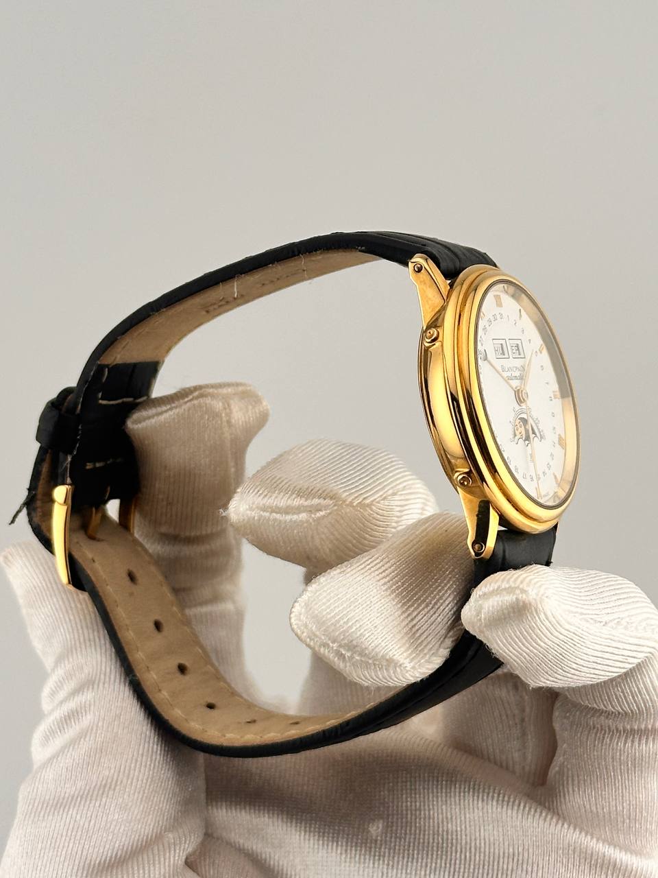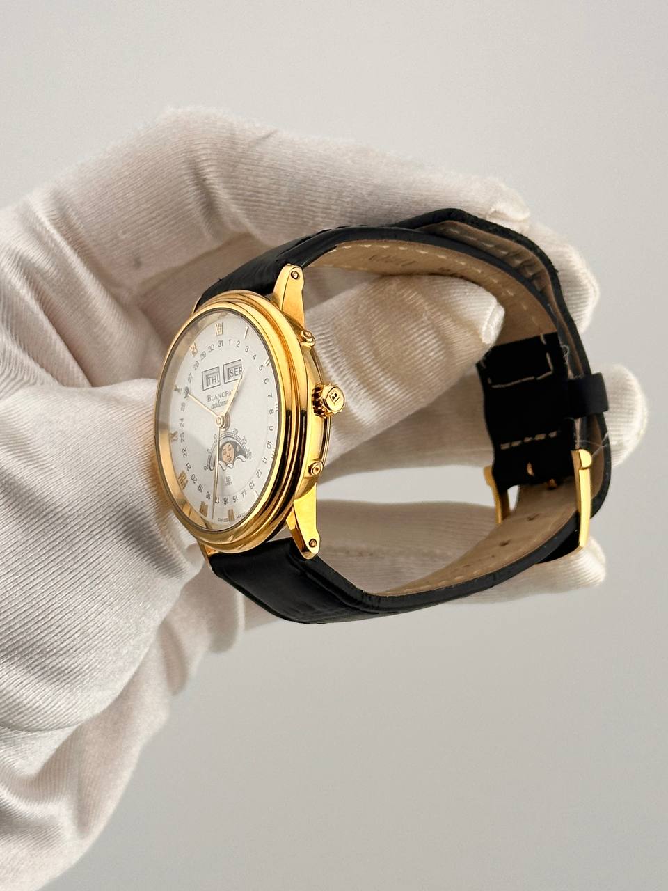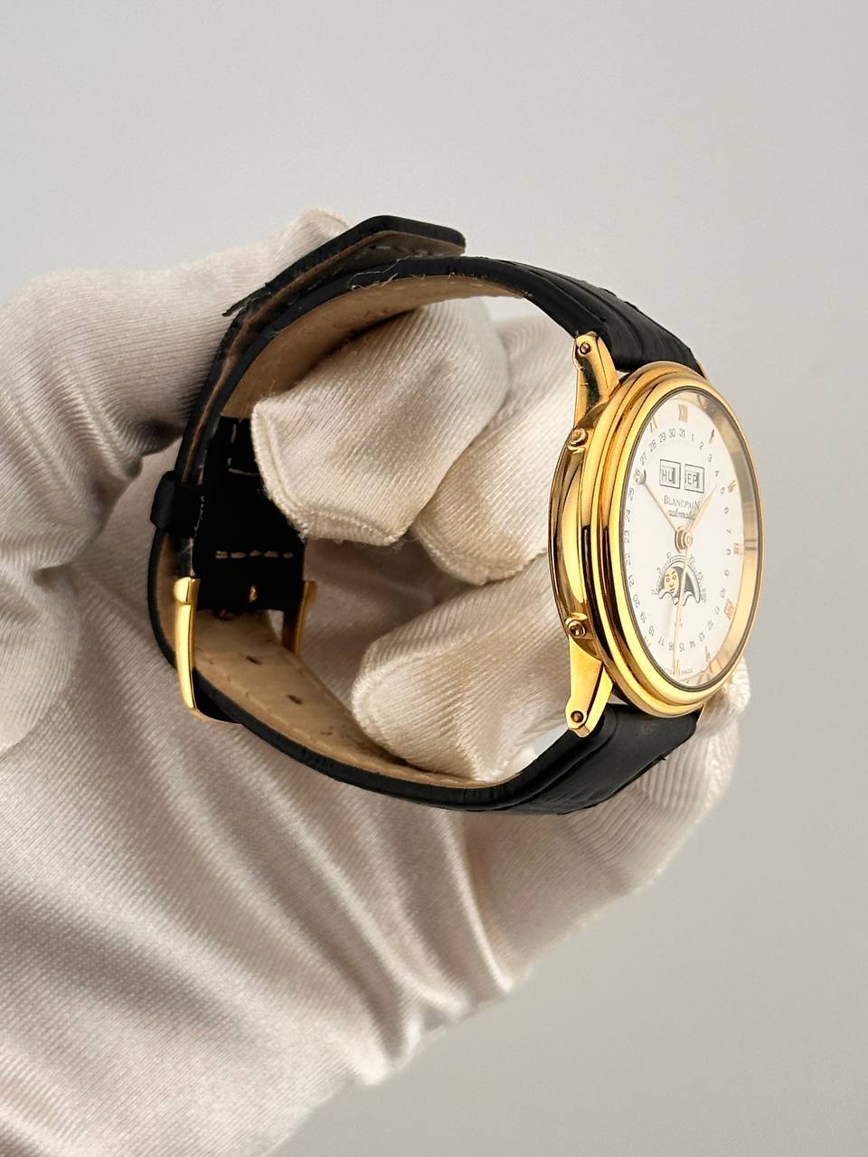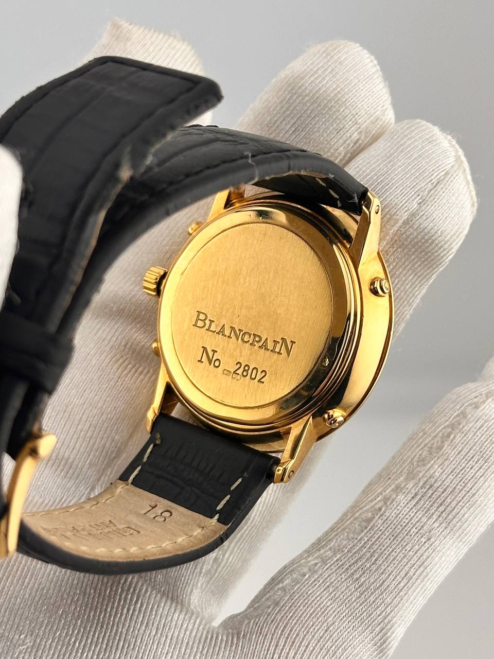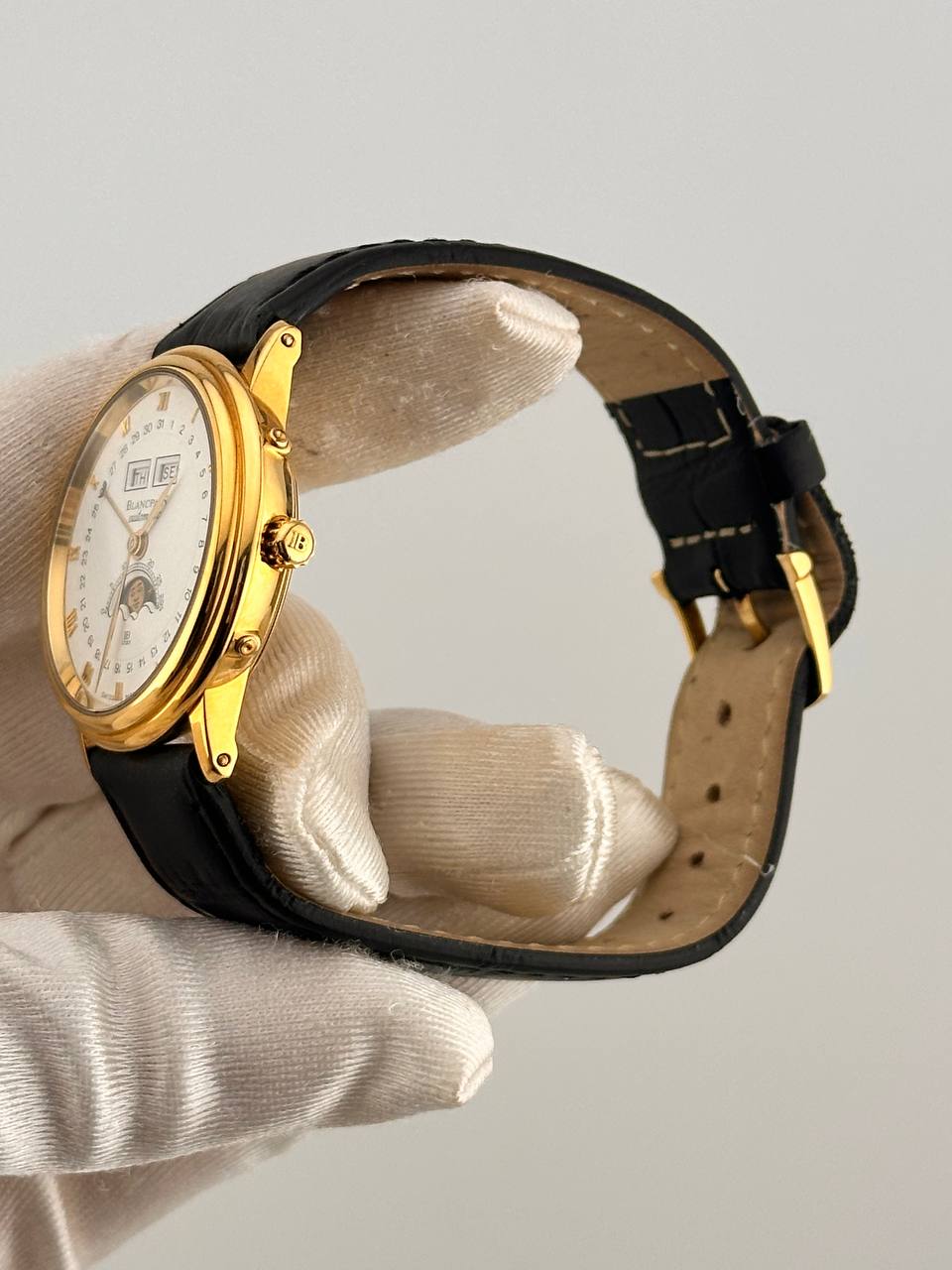 Классические швейцарские часы Blancpain Villeret в корпусе из желтого золота 750 пробы диаметром 34 мм. Модель оснащена надежным механизмом с автоподзаводом и дополнена элегантным кожаным ремешком. Изысканный дизайн и традиционное мастерство исполнения от старейшего часового бренда.