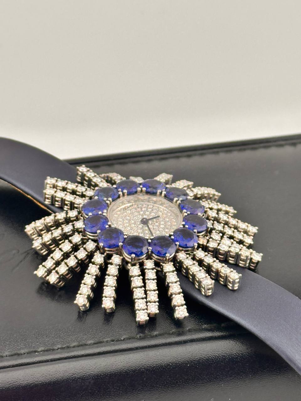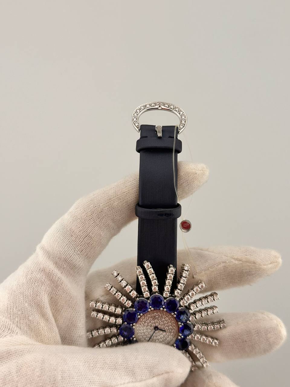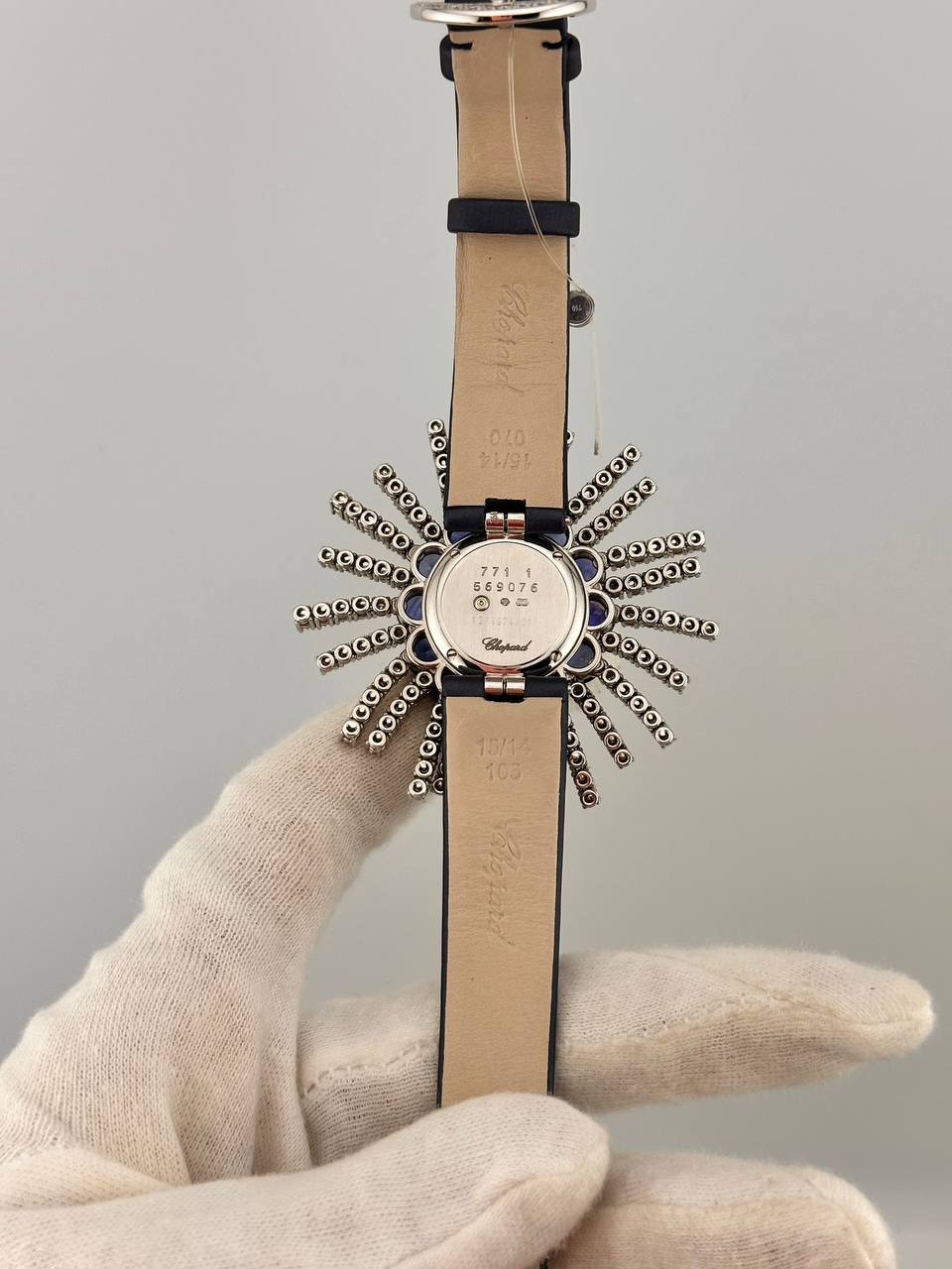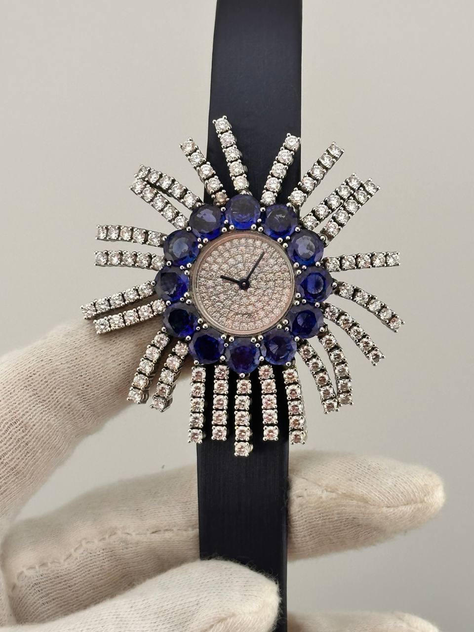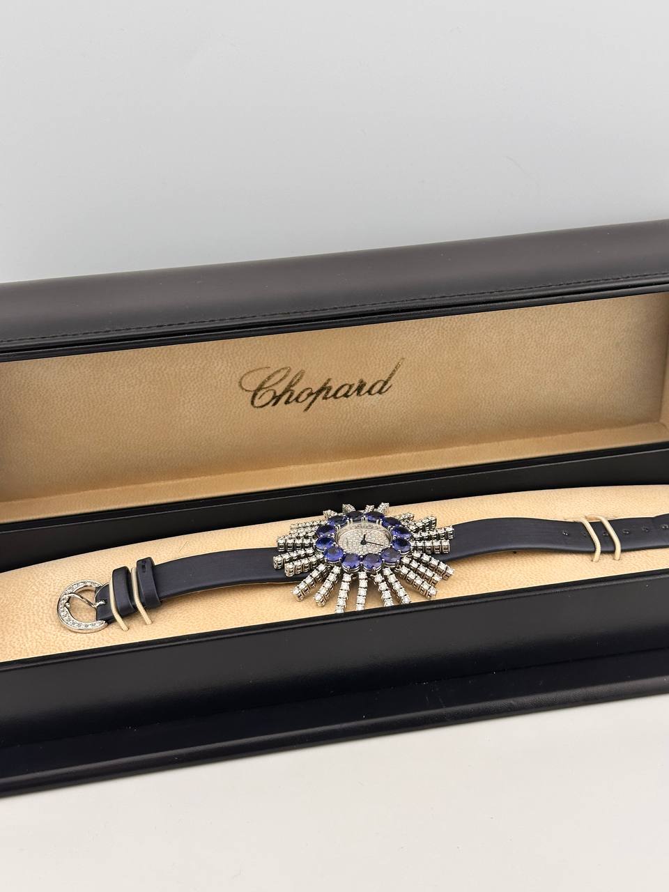 Роскошные швейцарские часы Chopard в изысканном корпусе из белого золота размером 53 х 26 мм. Модель оснащена точным кварцевым механизмом и дополнена элегантным сатиновым ремешком. Сочетание благородных материалов и утонченного дизайна подчеркивает высокий статус и безупречный вкус владельца.