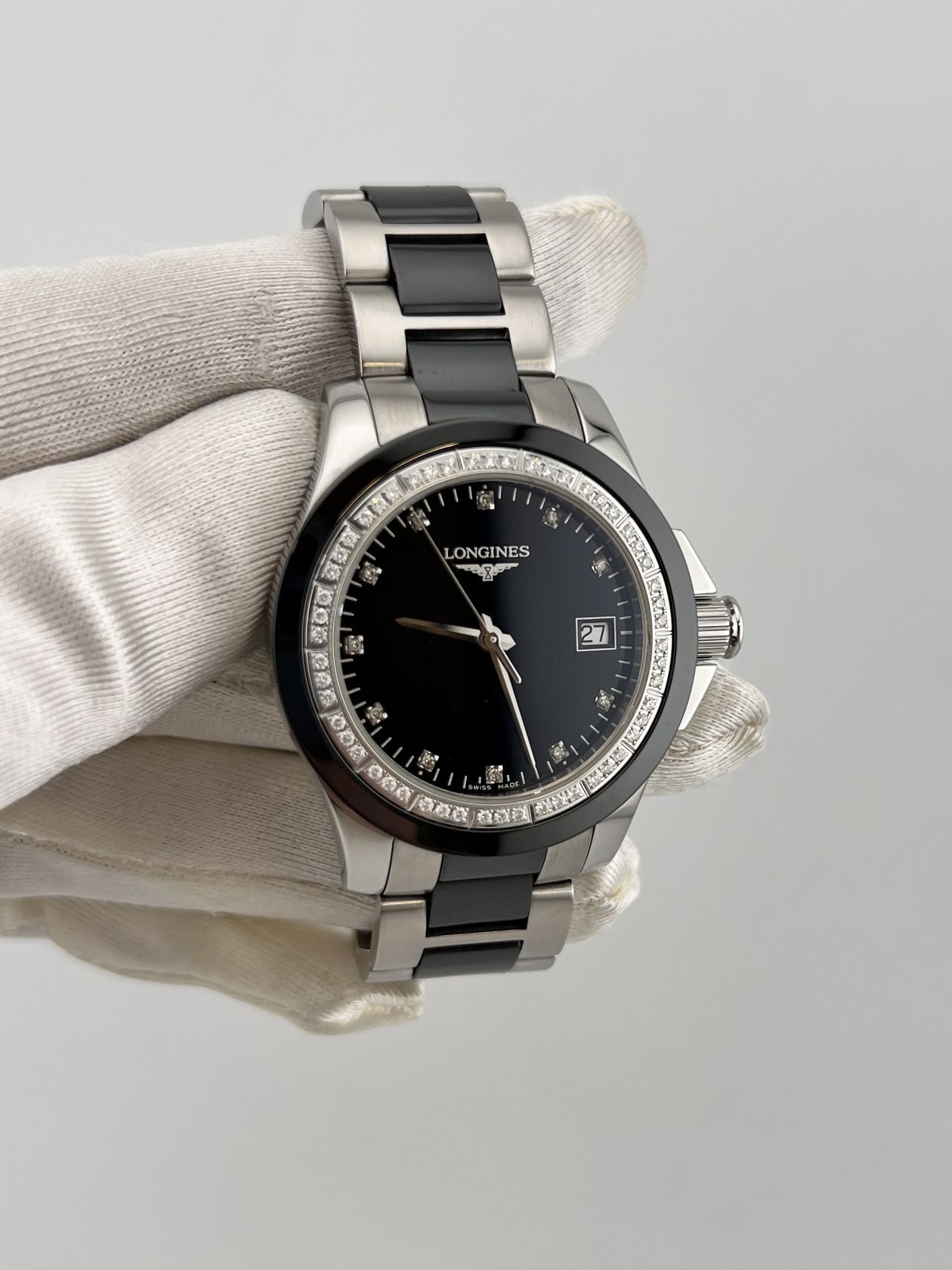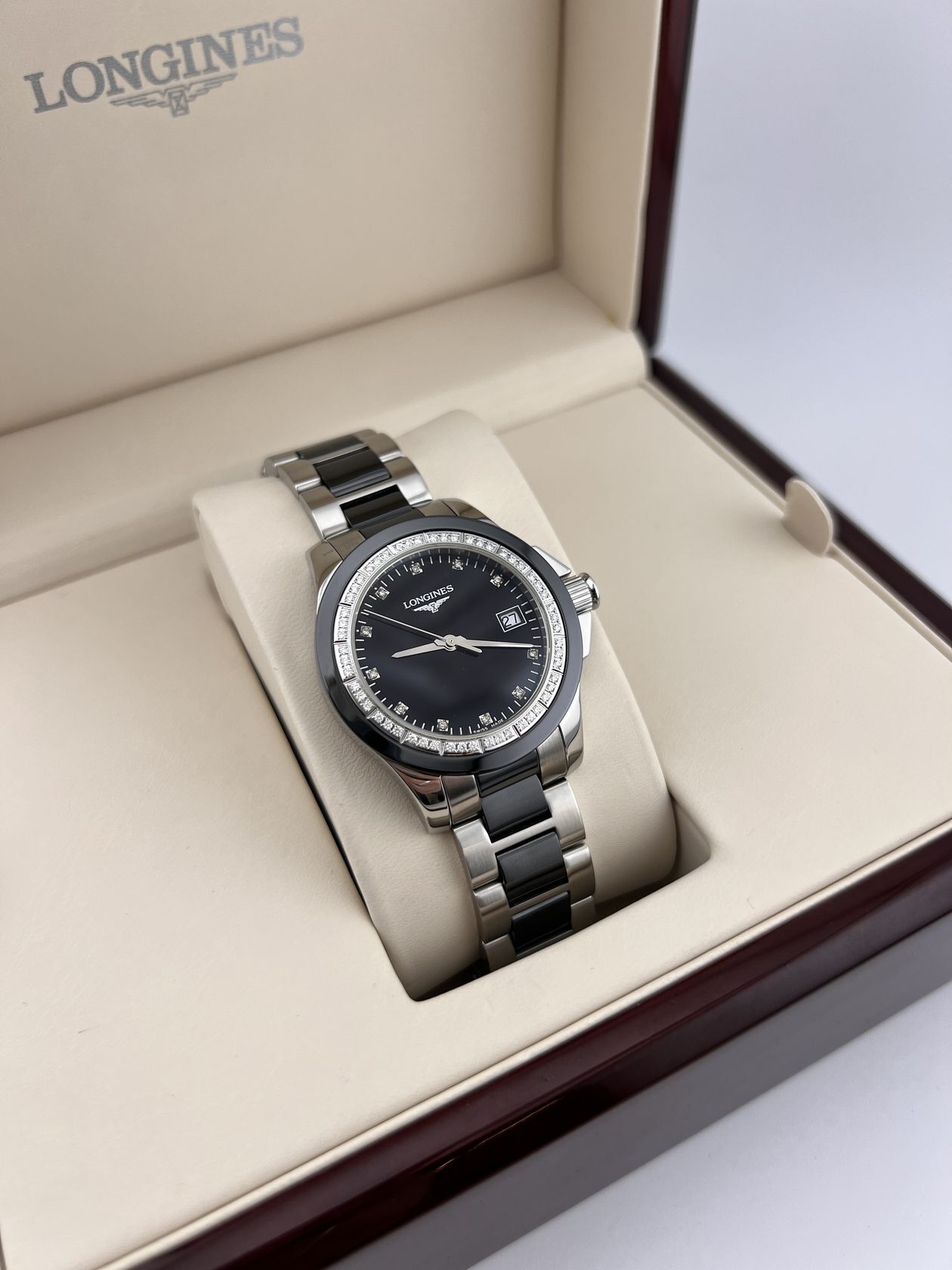 Элегантные швейцарские часы Longines Conquest в комбинированном корпусе из нержавеющей стали и керамики диаметром 35 мм. Модель оснащена точным кварцевым механизмом и дополнена стильным браслетом из стали и керамики. Сочетание спортивного стиля и утонченности от знаменитого бренда с многолетними традициями.
