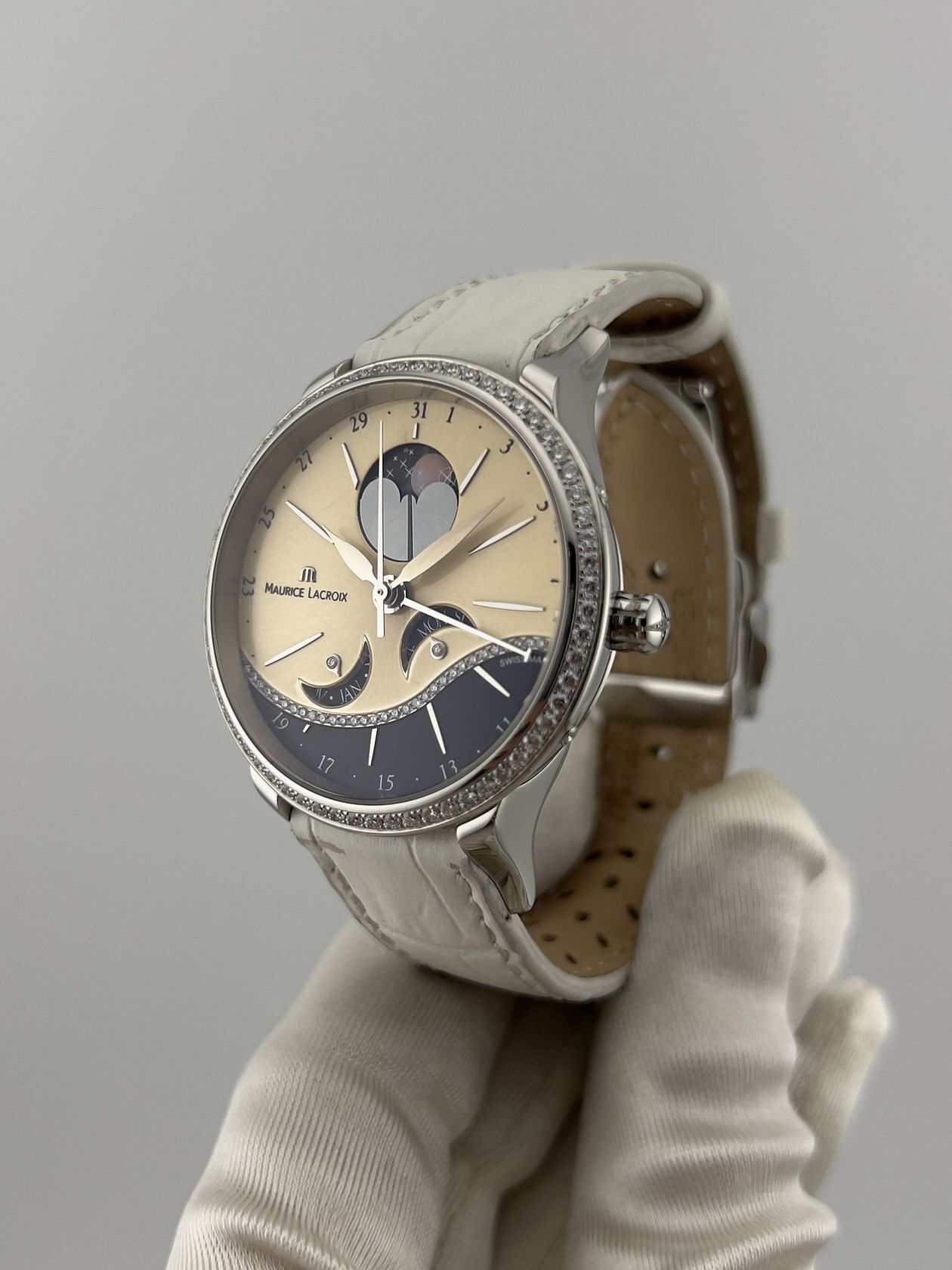 Изысканные швейцарские часы Maurice Lacroix Star Side в корпусе из нержавеющей стали диаметром 38 мм, украшенном сияющими бриллиантами. Модель оснащена надежным механизмом с автоподзаводом и дополнена элегантным кожаным ремешком. Сочетание роскошного декора и высокого часового искусства для утонченного образа.